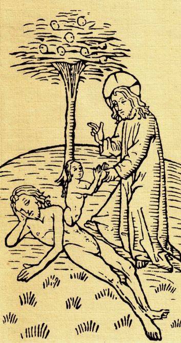 Chronik der Schöpfung - Kapitel: X-07, Abb.49 So hat man Kloning im Mittelalter dargestellt. Gott erschafft Eva aus Adams "Rippe". Im Hintergrund der Baum des Lebens.