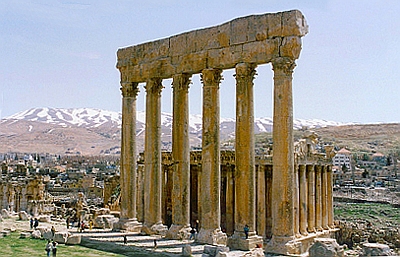 Chronik der Schöpfung - Kapitel: XI-01, Abb.58 Riesentempelruine von Baalbek. Im Hintergrund "normaler" Tempel. Vergleiche die Größe der Menschen. Wer waren die Baumeister?