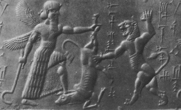 Chronik der Schöpfung - Kapitel: XI-02, Abb.66 Riesen-Gott Marduk, im "Adlergewand" der Igigi ("Engel"), hält mit einem Arm ein ausgewachsenes Rind hoch und macht einem Löwen die Beute streitig.